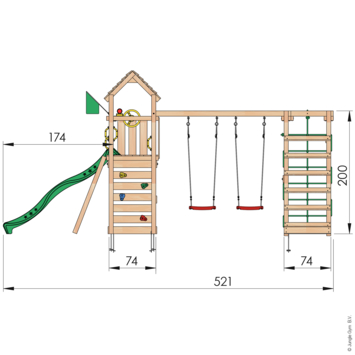 Het is de ideale droom voor elk kind: een speeltoestel met twee schommelzitjes, een klimrek met groot klimnet, een lange glijbaan, een zandbak, een klimwand met grote klimgrepen, een trapje, een telescoop en een stuur. Het speeltoestel is geschikt voor kinderen van 3 tot 10 jaar en wordt al 30 jaar ontworpen en geproduceerd in Nederland door Jungle Gym. Jungle Gym staat bekend om de topkwaliteit van hun speeltoestellen en veiligheid staat altijd voorop. Alle producten worden uitgebreid getest en voldoen aan de meest actuele Europese veiligheidsvoorschriften EN 71. Daarnaast zijn de speeltoestellen 100% compleet, aan alles is gedacht en standaard meegeleverd. De materialen zijn van hoge kwaliteit en weerbestendig en zijn praktisch onderhoudsvrij. Bovendien zijn de speeltoestellen kindveilig en bevatten geen toxische stoffen of allergenen.