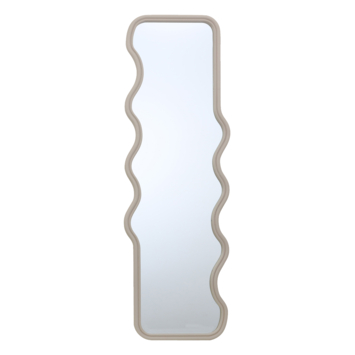 Prachtige golvende spiegel met een houten frame in een lichtgrijze kleur. De spiegel beschikt over de volgende afmetingen; 180x60x3 cm. De spiegel is ook verkrijgbaar in een mat witte kleur. Waar zet jij hem neer?