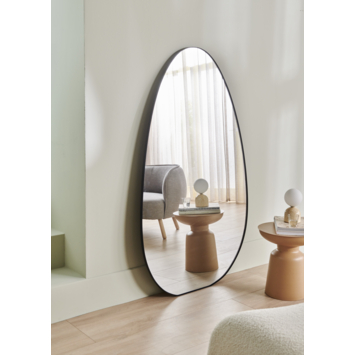 Mooie ovaal vormige spiegel met een zwarte rand. De rand is gemaakt van metaal. De spiegel heeft een diameter van 90 cm.