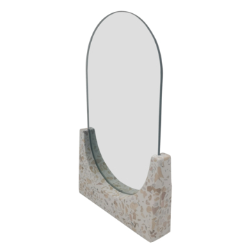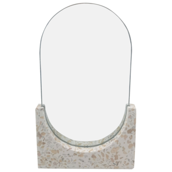 Een leuk en mooi ovalen spiegeltje op een marmer blokje. Erg leuk voor in de slaapkamer.