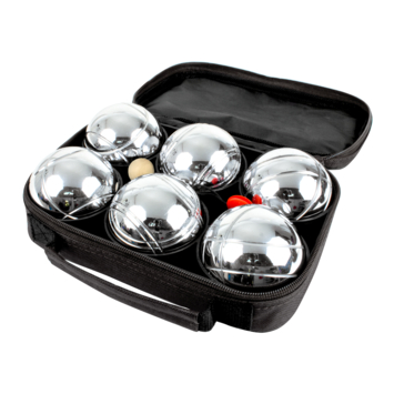 Set van zes SportX jeu de boules ballen. Met houten balletje en meetkoord. Ideaal om mee te nemen. Wordt geleverd in stevige tas met SportX-borduring.