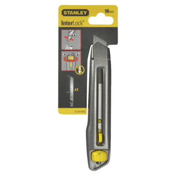 Het Stanley afbreekmes Interlock 0-10-018 is een praktisch licht en robuust mes. De metalen afbreekmes is 165 millimeter lang en heeft een lemmet van 18 millimeter breed. De Interlock neusverbinding zorgt dat het snijmesje niet naar boven gedrukt kan worden, zelfs niet onder grote kracht. Door het gebruiksvriendelijk wisselsysteem, heb je geen gereedschap meer nodig bij het wisselen van het mes. In uitgeschoven positie wordt het snijmesje onwrikbaar vastgeklemd, zodat het onbedoeld kan terugschieten.