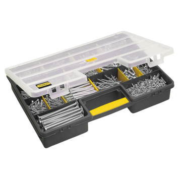 De Stanley assortimentsdoos 25-vaks met flexibele indeling is ideaal voor het overzichtelijk opbergen van klein gereedschap en accessoires. Met de uitneembare tussenschotten kun je de vakken naar eigen inzicht indelen, zodat je accessoires zoals pluggen, schroeven en spijkers op maat kunt sorteren en opbergen. Door de transparant deksel is in één opslag te zien wat er in de doos is opgeborgen. De stevige kunststof assortimentsdoos is circa 32,5 centimeter lang, 46 centimeter breed en 8 centimeter diep.