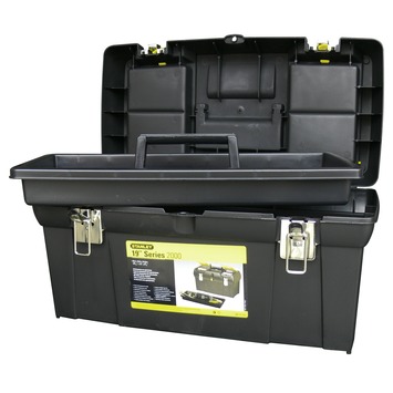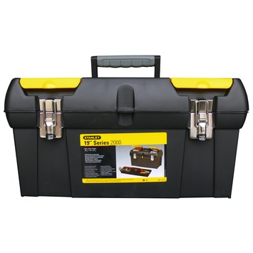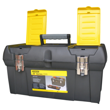 De Stanley gereedschapskoffer ca. 25x49x25 cm is een ruime stevig uitgevoerde gereedschapskoffer. Het deksel is voorzien van twee compartimenten, waar je accessoires zoals bouten, moeren, spijkers, pluggen en dergelijke overzichtelijk kunt opbergen. De koffer wordt afgesloten door middel van stevige metalen sluitingen. Je kunt de koffer extra afsluiten met een hangslot (niet meegeleverd), zodat je jouw kostbare gereedschap veilig kunt opbergen. Deze Stanley gereedschapskoffer is circa 25 centimeter hoog, 49 centimeter breed en 25 centimeter diep.