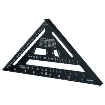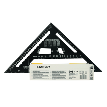 STANLEY bouwdriehoek STHT46102-0 is een zeer veelzijdige hulp bij al je projecten. Een zijde is voorzien van een extra dik profiel, zodat je het kunt gebruiken als zaaggeleider. Met 90° gradenboog met schaalverdeling per 1 graad voor het eenvoudig meten van hoeken. Maatvoering voor standaardhoeken van dakspanten voor het gemakkelijk en snel aftekenen van hoeken. Voorzien van diverse uitsparingen om je potlood op z'n plaats te houden, zodat je perfecte lijnen kunt trekken over de gehele lengte van een plank. Met pivoteerpunt voor gebruik als gradenboog. Door z'n afmeting past het makkelijk in je gereedschapskist. Materiaal: aluminium. Lengte: 300mm