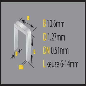 De Stanley nieten type G 12 mm 1000 stuks zijn stalen nieten die gebruikt kunnen worden in handtackers en elektrische nietmachines. Deze nietjes zijn van het type G (4/11/140) en hebben een hoogte van 12 mm. De nietjes zitten in een verpakking met een inhoud van 1000 stuks.