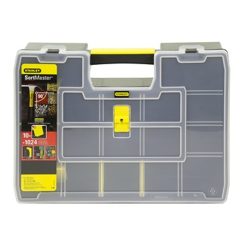 De Stanley assortimentsdoos zwart/geel Sortmaster is een handige organizer. Dankzij de uitneembare scheidingen zijn er tot wel 1024 configuraties mogelijk. De doos is handig om gereedschappen en kleine onderdelen in op te bergen. U kunt er zelfs uw hamers in kwijt. De assortimentsdoos is uitgerust met een goed vergrendelbaar deksel. Dankzij de dekselstructuur blijven alle kleine onderdelen op hun plaats, ook wanneer u de doos onderweg meeneemt.