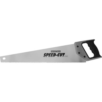 Scherp geslepen hardpoint handzaag met speciale coating voor een lage weerstand en sneller en gladder zagen, voorkomt tevens roesten. 2 componenten zwart/grijs kunststof handgreep met 45° en 90° aftekenhoeken. Inclusief beschermstrip en ophanggat.