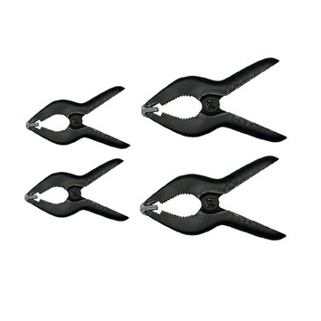 Set à 4 zwart kunststof snelklemmen met een veer en beweegbare klemvoetjes, die zich automatisch aanpassen aan het te klemmen werkstuk. Uitstekend klemmiddel voor hobby en huishoudelijk gebruik. Inhoud: 2 x 853.2.1010, 2 x 853.2.1015