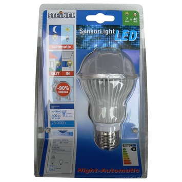 De Steinel ledlamp met schemerschakelaar sensorlight levert een wit (3.200K) kleur licht. Met zijn E27 (grote) fitting maak deze 230V lamp overal toepasbaar. Deze ledlamp verbruikt 7 watt en vervangt een gloeilamp van ongeveer 35 watt. Het aantal lumen is 400 met een kleurweergave van 80. De stralingshoek is 120 graden rondom. De verwachte levensduur is 25.000 branduren. Bij normaal gebruik geldt een garantie van 2 jaar.
