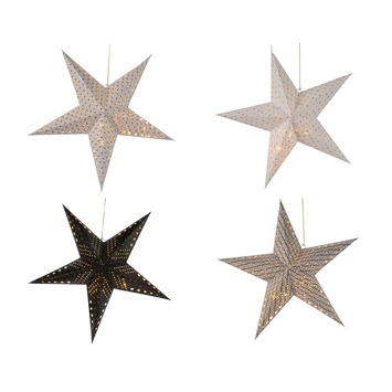 Extra sfeer in huis met deze leuke LED ster van papier. Verkrijgbaar in vier verschillende prints met goud, zwart of wit. De sterren worden per stuk verkocht. De omtrek afmeting van de ster is 60 cm met een snoer van 40 cm op de sterren op te kunnen hangen. Werkt op 3xAA batterijeren ( wordt niet meegeleverd). De led lampjes zijn vervangbaar.