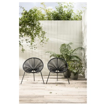 De stoel Haïti zwart is een hippe stoel voor op je terras. Het frame is gemaakt van metaal en het zitgedeelte van kunststof draden. Het opvallende unieke design zorgt ervoor dat deze stoel een echte eye-catcher is in je tuin. Deze zwarte stoel is ook verkrijgbaar in de kleuren mintgroen en wit. Door deze opvallende stoel in diverse kleuren te combineren, maak jij je tuin klaar voor een kleurrijk en trendy spetterend tuinfeestje.