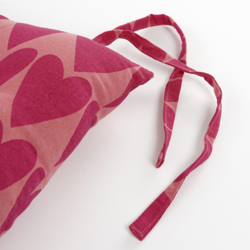 Het roze hartjesmotief geeft het kussen een speelse en gezellige uitstraling, wat het perfect maakt voor iedere ruimte waar je wat extra sfeer wilt toevoegen. Of je het nu in de tuin of binnen gebruikt, dit kussen is een stijlvolle en praktische keuze voor elke stoel.