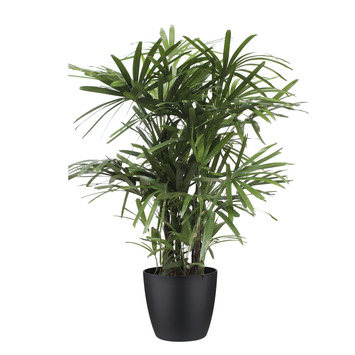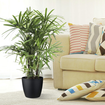 De Rhapis palm, ook wel de Stokpalm genoemd, dankt zijn naam aan de bamboeachtige stammen. Het is de sterktste kamerpalm die er is. De plant is inclusief een ronde bloempot van het merk Elho in de kleur Zwart. De Stokpalm heeft een hoogte van 110 centimeter en een potmaat van 27 cm. De palm komt oorspronkelijk uit de schaduwrijke regenwouden in Zuid-China. De plant heeft daarom geen enkele moeite met een schaduwrijke plek. De Stokpalm is een oersterke plant. Weinig licht, vloerverwarming, hoge of lage luchtvochtigheid, het maakt deze palm allemaal niet uit. Deze kamerplant doet het overal goed.