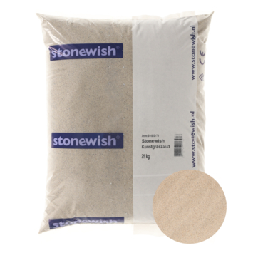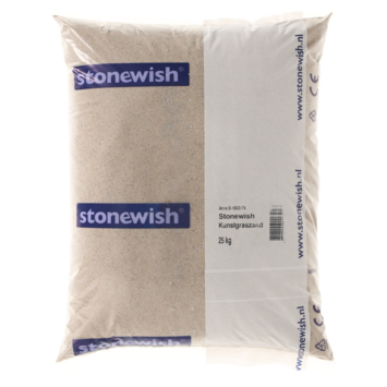 Stonewish kunstgraszand 25 kg is bedoeld voor het instrooien van kunstgras na het leggen. Dit zand bestaat uit afgeronde silicazandkorrels met een korrelgrootte van 0.2 tot 1 mm. Door de ronde en fijne structuur zakt het zand diep tussen de kunstgrassprietjes. Daar geeft het ondersteuning aan de vezels, waardoor ze beter rechtop blijven staan. Zo wordt het natuurlijke proces van platliggen vertraagd en blijft het kunstgras langer netjes ogen.