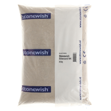 Zilverzand, ook bekend als kwartszand, is een zeer zuiver wit zand met een fijne korrelstructuur. Dankzij het lage ijzergehalte en het hoge kwartsgehalte heeft dit zand een heldere wit-grijze kleur. De fijne korrel maakt het eenvoudig voegen in te vegen met een kokosbezem zonder krassen op tegels, ideaal voor sierbestrating. Leverbaar in 25 kg zakken.