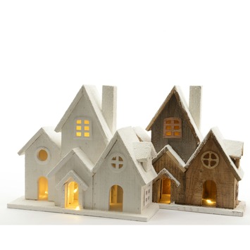 Voor onder kerstboom, op de vensterbank of op een sidetable, deze straat met houten huizen. De afmeting is (bxdxh): 36x12x30 cm en is er in het naturel of wit gelakt. De ingebouwde energiezuinige batterij LED verlichting geeft een heerlijk warm winterseffect. Werkt op 3 AA batterijen die apart verkrijgbaar zijn (branduren circa 48 uur). In deze serie is er ook een houten toren van 42 cm hoog verkrijgbaar.