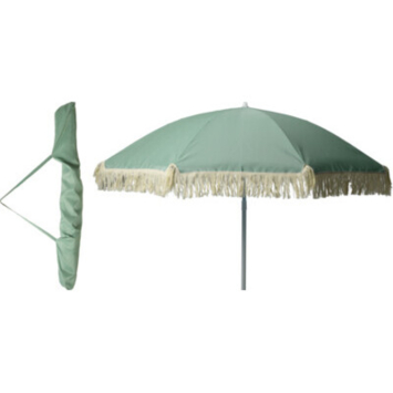 Deze groene parasol met franjes is een echte eyecatcher voor in jouw tuin tijdens een zonnige dag. Of je nu gaat voor een relaxte dag met een boek op schoot of je kiest voor een tuinfeest, deze parasol zorgt voor sfeer. De parasol is ook geschikt om mee te nemen naar het strand. Met de beige franjes en een diameter van 155 cm is deze strandparasol compact en toch stijlvol.