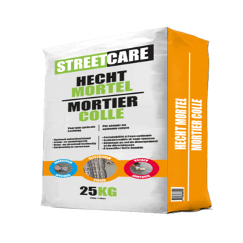 De Streetcare drainagemortel hechtend 25 kg is geschikt voor de verlijming van straatwerk op de Streetcare drainagemortel en zorgt hiermee voor een zeer goede hechting met deze ondergrond. Streetcare hechtmortel is zowel binnen als buiten te gebruiken en zorgt voor een krachtige verbinding tussen betonsteen/natuursteen/keramische tegels en cementaire of drainerende ondergronden (waar Streetcare drainagemortel is gebruikt). De Streetcare hechtmortel wordt op de onderzijde van de bestrating aangebracht waarbij voorkomen dient te worden dat de hechtmortel tussen de voegen van het straatwerk komt. Het straatwerk kan tenslotte ingewassen worden met de Streetcare voegmortel.