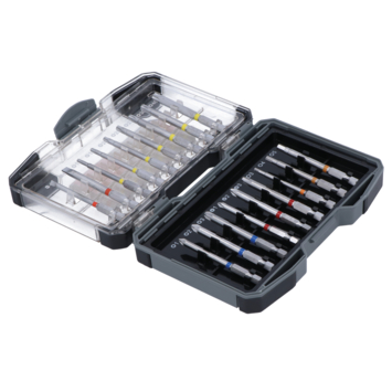 Deze 18-delige bitset van hoge professionele kwaliteit gehard S2-staal met extra lange bits zijn uitermate geschikt voor diepliggende schroeven. Het handige kleurcodesysteem zorgt voor een snelle herkenning van de bitsoort. De set in de overzichtelijke cassette voorziet in de meest gebruikelijke bitmaten; SL 4-6 mm; HEX 3-4-5; T 10-15-20-25-27-30-40; PH 1-2-3; PZ 1-2-3