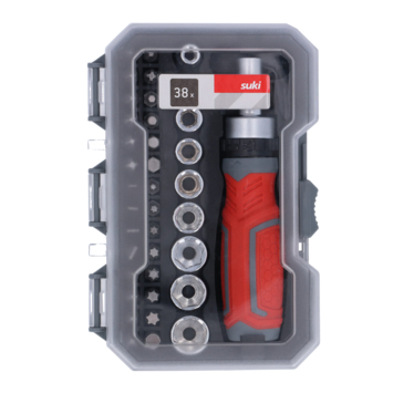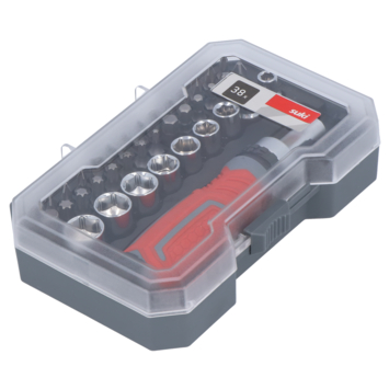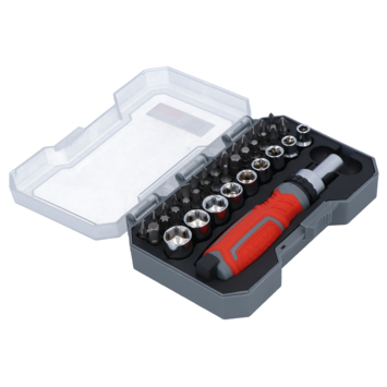 Deze 38-delige bit- en doppenset van hoogwaardig Chroom-Vanadiumstaal bevat behalve de bits en schroefdoppen ook een handige schroevendraaier met ratel met magnetische bitopname. De set in de overzichtelijke cassette voorziet in de meest gebruikelijke bit- en schroefdopmaten; Bits: SL 3-4-5-6 mm; PH 0-1-1-2-2-3; PZ 0-1-1-2-2-3; HEX 3-4-5-6; T 10-15-20-25-27-30-35; Schroefdoppen; 5-6-7-8-9-10-11-12-13 mm; 1 bit/dop-adapter;