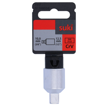 De suki-adapter 3/8x1/2? en 10x12.7mm is een adapter waarmee u dopsleutels verbindt aan hulpstukken. Het verloopstuk is geschikt voor dopsleutels van 1/2inch, oftewel 12,7mm, en hulpstukken van 3/8inch, oftewel 10mm. U gebruikt de adapter om met een dopsleutel van 12,7mm bouten van 10mm los of vast te draaien. Met behulp van deze adapter voor dopsleutels en bouten verbindt u zo twee delen aan elkaar die gewoonlijk niet op elkaar passen.