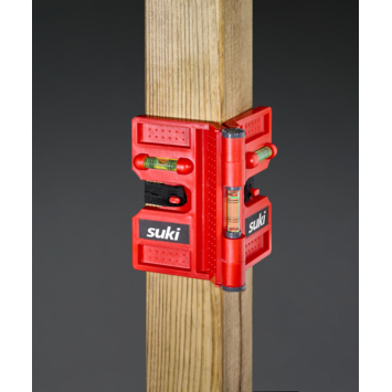 De suki-hoekwaterpas is ideaal voor het plaatsen van onder andere palen en schuttingen. De waterpas heeft een dubbele libelle waardoor de waterpas makkelijk af te lezen is, zowel horizontaal als verticaal. Palen kunnen hierdoor in twee richtingen waterpas worden gemaakt. De snoerhouders waarvan de hoekwaterpas is voorzien, zijn handig bij het uitlijnen van de maten met het suki-metselkoord. Kortom, de suki-hoekwaterpas zorgt ervoor dat u kaarsrechte schuttingen en soortgelijke bouwwerken plaatst.