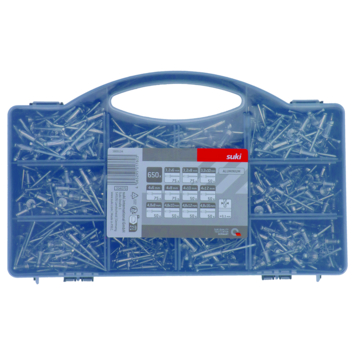 Met deze assortimentskoffer met 650 blindklinknagels ofwel popnagels in de maten 3,2, 4,0 en 4,8 mm heeft u altijd de juiste maat klinknagel beschikbaar. Met deze nagels verbindt dunne metalen platen permanent aan elkaar. De suki blindklinknagels, ook wel bekend onder de naam popnagels, zijn gemaakt van aluminium en daardoor weerbestendig. U brengt de blindklinknagels aan met de daarvoor bestemde suki blindklinktang. Het verwijderen van de blindklinknagels doet u eenvoudig met behulp van een metaalboor. De blindklinknagels zijn verpakt per 100 stuks.