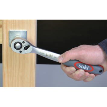 De suki-ratelsleutel met 1/2"-verbinding, een verbinding van 12,7mm, is geschikt voor dopsleutels. De ratelsleutel is namelijk voorzien van een blokkering die voorkomt dat de dopsleutel eraf valt. Tegelijkertijd is de dopsleutel door de handige knop op de ratelsleutel makkelijk te verwisselen. Door de ratel van de sleutel heen en weer te bewegen draait u moeren los of vast. De 1/2inch-ratelsleutel is gemaakt van hoogwaardig chroom-vanadiumstaal. Ook schakelt u de ratelsleutel met 12,7mm-verbinding eenvoudig links- of rechtsom dankzij de omstelknop. De 1/2inch-ratelsleutel van suki kan zowel voor professionele als hobbymatige doeleinden worden gebruikt.