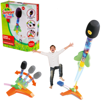 Summertime Power Rocket, in XL-uitvoering. Met een flinke stamp op de launch pad, schiet de raket hoog de lucht in! De raketten zijn vervaardigd uit zacht foam.