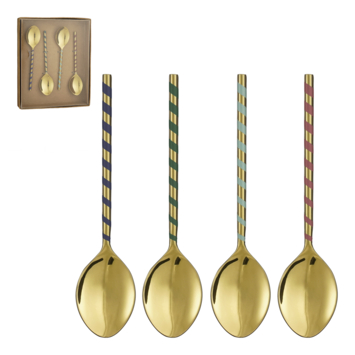 Voeg een luxueuze touch toe aan je bestek met deze swirl lepel, een set van 4 stuks in de kleuren donkerblauw, groen, lichtblauw en rood. Gemaakt van stainless steel en gecombineerd met een gouden accent, straalt deze lepel luxe uit. Met een lengte van 15 cm is hij perfect voor desserts en speciale gelegenheden. Deze lepel is niet alleen functioneel, maar ook een prachtig decoratief stuk voor je tafel. Upgrade je bestekcollectie met deze stijlvolle swirl lepel.