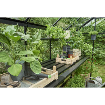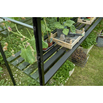 Deze zwarte geïntegreerde aluminium kweektafel is precies passend leverbaar voor de Birdlip 48. De lengte van de tafel is gelijk aan de binnenmaat van de langste zijde van de kas. De hoogte is instelbaar is voor een optimale werkhouding, dus zaaien en kweken op stahoogte! De tafel heeft een breedte van 40 cm breed.