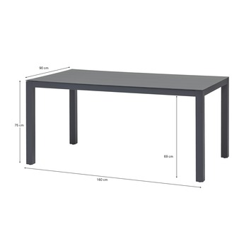 De tafel Valencia is 160 centimeter lang, 90 centimeter breed en 78 centimeter hoog.