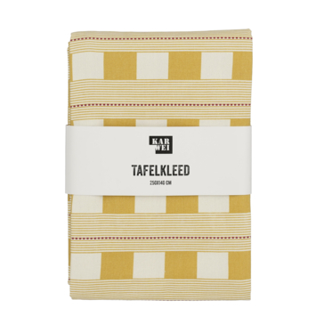 Breng je eettafel tot een gezellige setting met dit stijlvolle tafelkleed in een opvallende blockprint. De combinatie van okergeel en witte blokken met subtiele strepen zorgt voor een frisse, moderne uitstraling. Dit tafelkleed heeft de ideale afmetingen van L250 x B140 cm, waardoor het perfect is voor een grotere tafel. Het is gemaakt van gerecycled katoen. Dit kleed voegt een vrolijke en verzorgde touch toe aan je tafel, perfect voor dagelijks gebruik of speciale momenten.