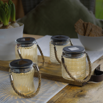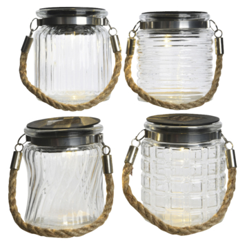 Maak een gezellige sfeer op de buitentafel met deze weckpotjes. Bovenop de weckpot zit een zonnepaneel wat een totale lichtopbrengst geeft van 6 uur. De weckpotjes zijn voorzien van een LED lamp en verkrijgbaar in 4 verschillende dessins. Hierdoor kan je er op je tafel ook een mix van maken. Aan iedere lamp is een touw bevestigd waardoor je ze ook kunt ophangen in de boom of aan de schutting.