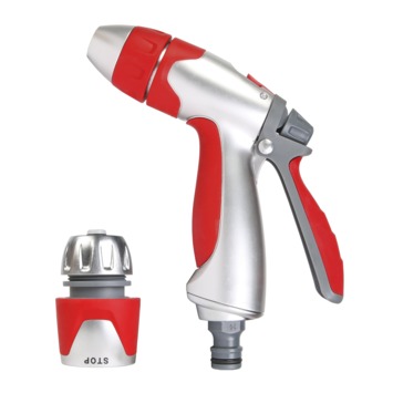 De spuitpistool met slangkoppeling waterstop ligt comfortabel in de hand dankzij het antislip handvat. De waterstraal is eenvoudig aan te passen doormiddel van de rubberen verstelring van een fijne sproeinevel tot een volle straal. Hierdoor is dit waterpistool geschikt om te reinigen en om planten water te geven. De watertoevoer kunt u doormiddel van de impulsgreep regelen, deze kan ook vastgezet worden om langdurig sproeien eenvoudiger te maken. De spuitpistool kan eenvoudig aan de tuinslang bevestigt worden door middel van de 1/2” slangkoppeling met waterstop.
