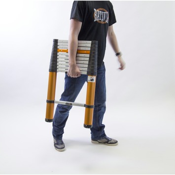 Deze Giraffe Air telescopische ladder van Batavia is compact op te bergen en toepasbaar voor uitleenlopende werkzaamheden. Wanneer de trap helemaal is ingeschoven heeft deze een lengte van 80 cm waarmee deze telescopische ladder zeer praktisch om op te bergen. Deze ladder heeft 11 treden die variabel in te stellen zijn tot een maximale werkhoogte van 3.21 meter en heeft een comfortabel stavlak. Met een draaggewicht van maximaal 150 kilo en met zijn antisliptreden is deze trap robuust en veilig. De treden vergrendelen zichzelf tijdens het uitschuiven van de ladder en zijn door middel van ontgrendelknoppen weer in elkaar te klappen. Met dit systeem kunnen jouw vingers niet tussen de treden komen en kunt je de trap veilig opklimmen.