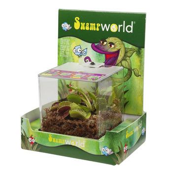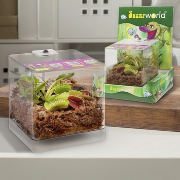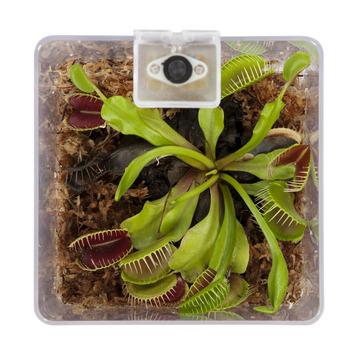 Een leuk terrarium met een 'Venus Vliegenval'plant en lampje. Deze vleeseter helpt je van ongewenste insecten af. Het terrarium heeft een afmeting van 10 x 10 x 12 centimeter. Zet ’s avonds het lampje van het terrarium aan en de insecten komen er vanzelf op af. De Venus Vliegenval is een mooie groene vleesetende plant, waarvan de dichtklappende bladeren van binnen dieprood kunnen kleuren. Leuk om te geven of op zet deze natuurlijke insectenvanger op een nachtkastje in een kinderkamer. Het terrarium wordt exclusief 2x AAA batterijen geleverd.