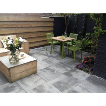 De Hollywood terrastegel is uitgevoerd met een dubbele coating en een leistenen structuur. De tegel is vanwege zijn coating alg- en mosremmend, kleurecht en eenvoudig te reinigen. De meerwaarde van betontegels zit hem in de stevigheid van de tegel. Terrastegels van beton zijn vorstbestendig, krasbestendig en liggen na het leggen stevig in een geheel. Een tegel van keramiek is vrijwel altijd dunner en lichter dan een tuintegel van beton. Het gevolg daarvan is dat je dure tegellijm nodig hebt om je terras stevig te kunnen leggen. Met betonnen tuintegels ligt je terras van zichzelf al stevig. Aftrillen wordt echter afgeraden, want tegels groter dan 50x50 cm zijn gevoeliger voor breuken. Mochten de tegels niet helemaal uitkomen, dan moet er gezaagd worden. Doe dit nooit direct boven de tegels. De cementresten die loslaten zijn vrij lastig schoon te maken. Als het terras eenmaal ligt speelt het onderhoud een rol. Veeg regelmatig de bladeren en ander vuil van de tegels af om vieze bruine plekken te voorkomen. Mocht het reinigen toch genoodzaakt zijn, doe dit dan met schoon water en natuurlijke zeep. Op die manier heb je het langst plezier van deze Terrastegel Beton Hollywood Grijs 60x60 cm - 36 Tegels / 12,96 m2. Bijtende stoffen en hogedrukreinigers zijn een minder goed idee, want deze kunnen de beschermende laag van de tegel aantasten.