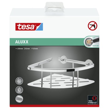 Het tesa® Aluxx hoek doucherek biedt een stijlvolle en praktische oplossing voor het opbergen van al je badkamerbenodigdheden. Dit rek is vervaardigd uit hoogglans verchroomd aluminium, wat zorgt voor een luxe uitstraling en een hoge bestendigheid tegen roest. Dankzij de slimme bodemplaat kunnen zeepresten en water makkelijk wegvloeien, zodat alles schoon en fris blijft. De installatie is een fluitje van een cent dankzij de innovatieve Power.Kit technologie: je hoeft niets te boren en je muren blijven intact. Volg simpelweg drie stappen: plak de adapters, vul ze met de Power.Kit-lijm en bevestig het rek na 12 uur uitharden. Dit hoekrek is niet alleen eenvoudig te monteren, maar ook makkelijk te verwijderen zonder lijmresten achter te laten. Wil je het doucherek opnieuw bevestigen? Dat kan met een aparte adapter set, die eenvoudig te verkrijgen is. Dit product is geschikt voor een breed scala aan oppervlakken, zoals tegels, metaal en glas, maar let op: het is niet geschikt voor behang of stucwerk.