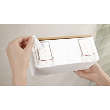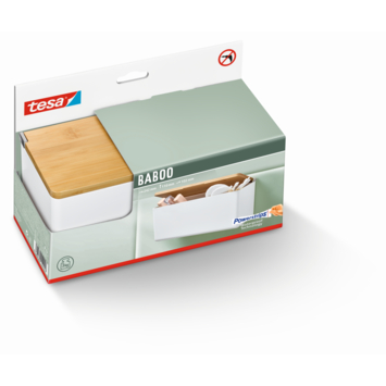 De middelgrote tesa® Baboo opberger is beschikbaar met een verdeler en deksel voor wandmontage. Het is eenvoudig te monteren zonder een boormachine, dankzij de tesa® Powerstrips Waterproof technologie. Het heeft een urban design met hoogwaardig mat wit kunststof en een deksel van natuurlijk bamboe. Deze opberger biedt slimme opbergruimte voor badkamerbenodigdheden zoals cosmetica, sieraden of wattenschijfjes, waardoor ze georganiseerd en binnen handbereik blijven. De meegeleverde zelfklevende tesa® Powerstrips Waterproof XL strips zorgen voor een waterbestendige hechting met een draagkracht tot 3 kg. Ze zijn gemakkelijk te verwijderen en laten geen lijmresten achter.