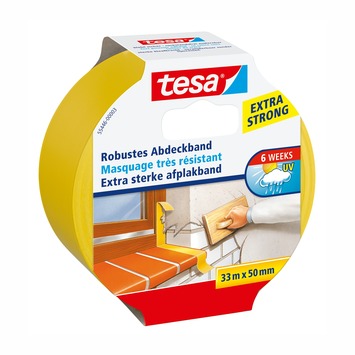 De Tesa Extra Sterk afplaktape 33mx50mm is een extra sterk PVC afplakband voor het beschermen van ondergronden bij het verven en bepleisteren. Geschikt voor toepassing binnen- en buitenshuis, ook op oneffen oppervlakken. De tape is UV- en weerbestendig en tot 6 weken na toepassing buitenshuis zonder sporen te verwijderen. De tape is met de hand in en af te scheuren.