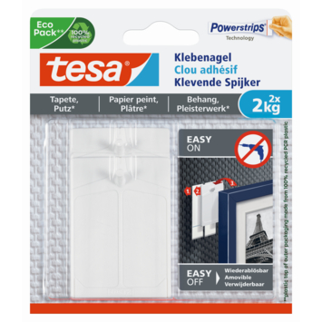 Tesa Klevende Spijker voor Behang & Pleisterwerk en de meegeleverde Klevende Strips zijn speciaal ontwikkeld om voorwerpen eenvoudig te monteren met betrouwbare hechting op oneffen en gevoelige oppervlakken. De Klevende Spijkers hebben een draagkracht van maximaal 2 kg per spijker. Ze zijn de manier om schilderijen of decoratie op te hangen zonder schade te veroorzaken. Dankzij de Powerstrips Technologie zijn ze supereenvoudig in het gebruik en kunnen ze worden verwijderd zonder sporen na te laten. Je kunt de Klevende Spijker zelfs opnieuw gebruiken met een nieuwe Klevende Strip.