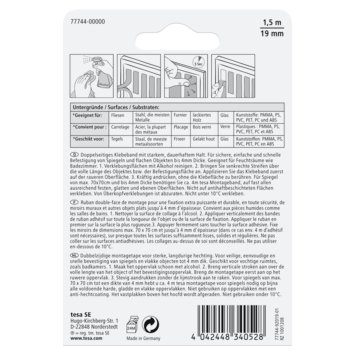 Tesa Montagetape voor Tegels & Metaal is speciaal ontwikkeld om spiegels en andere dunne voorwerpen (tot 4 mm dik) op te hangen op stevige en gladde oppervlakken zoals tegels, metaal en de meeste kunststof oppervlakken, zelfs in vochtige omgevingen zoals badkamers. De tape compenseert zelfs kleine onregelmatigheden op het oppervlak. Het is eenvoudig en handig in gebruik! Het enige gereedschap dat je nodig hebt, is een schaar en bovendien zorgt de tape voor langdurige en betrouwbare hechting.