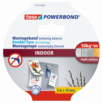 Tesa Powerbond Indoor montagetape dubbelzijdig wit 5 m x 19 mm is een sterke montagetape die geschikt is voor het vastzetten van objecten op zowel gladde als oneffen oppervlakken binnen. De tape is gemaakt van kunststof met een acryl basis die zorgt voor een betrouwbare hechting. Dankzij de uv-bestendigheid blijft de tape stabiel, ook als er zonlicht op valt. Je kunt hem gebruiken in allerlei ruimtes binnenshuis waar je zonder boren iets wilt bevestigen.