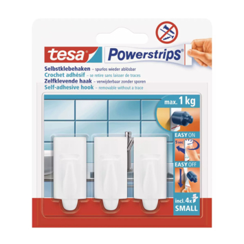 De Tesa Powerstrip haken zijn gemaakt van een hoge kwaliteit witte kunststof. Je kunt deze haken monteren zonder te boren of schroeven dankzij de Tesa Powerstrips technologie. Hiermee plak je ze eenvoudig op een gladde ondergrond. De haken hebben een draagkracht van 1 kg per stuk. Je kunt de haken gebruiken op tegels, glas, hout, plastic en andere gladde ondergronden (ze zijn niet geschikt voor gebruik op geschuimd en poreus materiaal). Dankzij de Powerstrips Large van Tesa kun je de haken opnieuw gebruiken. Je verwijdert ze zonder een spoor achter laten op de ondergrond. De haken hebben een trendy ontwerp in wit kunststof. De haken zijn tevens verkrijgbaar in een kleiner formaat of in een andere kleur. De Tesa Haak Powerstrip Wit Kunststof - wordt per 3 stuks verkocht.