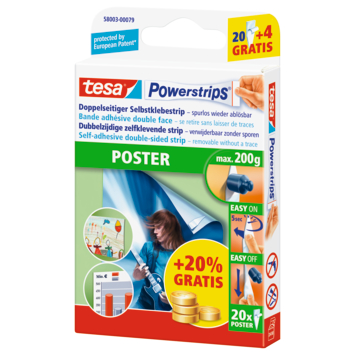 Tesa Powerstrip posterstrip wit (20 stuks) is een montagetape die je gebruikt om posters en lichtgewicht materialen binnen te bevestigen op gladde ondergronden. De tape heeft een rubberen kleeflaag en is UV-bestendig. Hij is geschikt voor verwerking bij temperaturen van 15 tot 40 graden en laat zich snel verwijderen zonder sporen achter te laten.