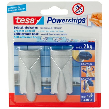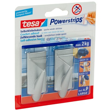 De Tesa Powerstrips haak groot 2 stuks mat chroom zijn 2 grote plakhaakjes van Tesa voor gebruik in huis. Ze zijn te bevestigen zonder boren en schroeven, dankzij de dubbelzijdige kleefstrips. De haakjes zijn gemaakt van hoge kwaliteit kunststof. De haakjes zitten per twee in de verpakking, samen met twee extra kleefstrips. Eén haakje kan maximaal 1,5 kilo dragen, je kunt daarom makkelijk 2 handdoeken aan één haakje hangen. De haakjes zijn erg gemakkelijk van het oppervlak af te halen, zonder sporen achter te laten.
