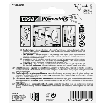 De Tesa Powerstrips set klein ovaal 3 stuks zijn drie praktische haken gemaakt van hoge kwaliteit kunststof. De haakjes zijn makkelijk te monteren zonder boren of schroeven dankzij de unieke tesa Powerstrips® technologie. De kleefkracht houdt tot 1 kilogram per haak vast op vlakke voorwerpen en de meeste gladde en voldoende stevige, schone ondergronden zoals tegels, (bak)steen, metaal en de meeste kunststoffen. Let op: niet geschikt voor gebruik op piepschuim, geschuimd materiaal of poreuze materialen.