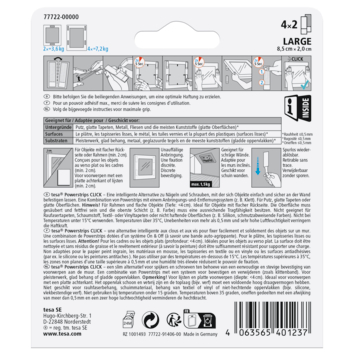 De Tesa Powerstrips CLICK Combo Large (4x2 stuks) zijn een handige oplossing voor het ophangen van foto’s en decoratieve objecten met een vlakke achterkant, zonder te hoeven boren. De zelfklevende strips worden aan de muur en het object bevestigd met het ON & OFF Click-systeem. Zodra je het decorstuk vastklikt, hoor je een klikgeluid dat bevestigt dat alles stevig op zijn plaats zit.